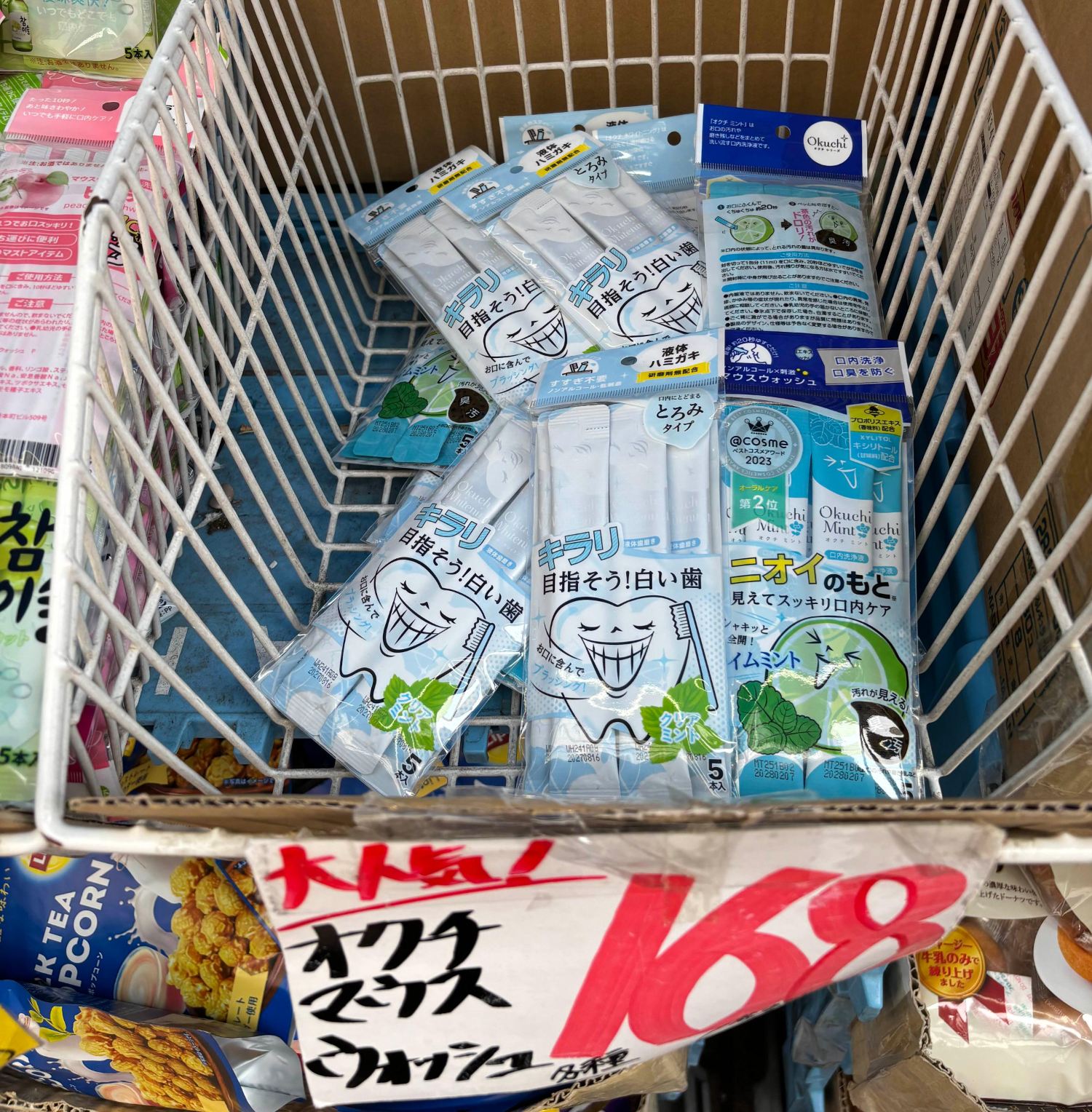 - 그리고 입안을 상쾌하게 해주는 오구치 마우스워시는 168엔, 심지어 '참이슬 마우스워시'는 158엔(세금 포함 179엔)이라는 파격적인 가격에 판매 중이었습니다.