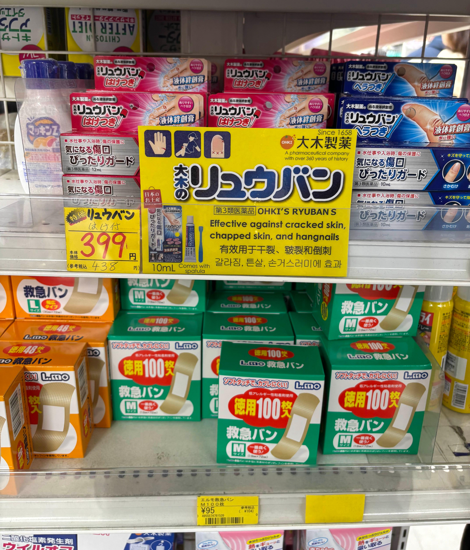- 류반 액체 반창고: 상처에 바르는 액체 반창고인 류반은 갈라짐, 튼살, 손거스러미에 효과가 있다고 합니다. 399엔(세금 포함 438엔)