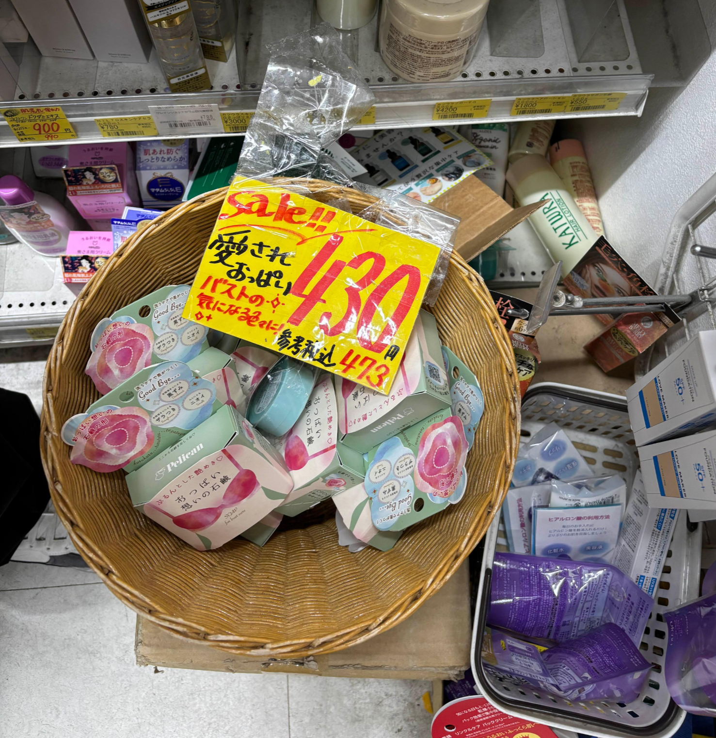 세일 중이던 펠리칸 바스트비누는 가슴 전용 비누인데, 430엔(세금 포함 473엔)이었어요.